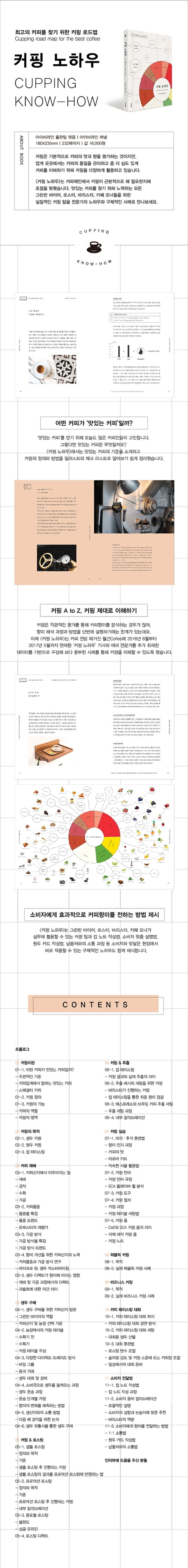 커피업계 곳곳에 존재하며, 커피를 심도 있게 이해하기 위한 필수 지식으로 자리 잡은 커핑. 『커핑 노하우(Cupping Know-How)』은 커피 전문 매거진 [월간Coffee]에 2016년 6월부터 2017년 5월까지 연재된 '커핑 노하우' 기사와 추가 취재 데이터를 기반으로 작성되었으며, 커핑의 기초부터 심화 내용까지 여러 전문가의 의견을 통해 독자가 스스로 커핑 노하우를 터득하는 데 도움이 되도록 구성했다. 커피는 직관적인 평가를 통해 향미를 분석하는 부분이 많아, 그 향미를 하나하나 해석하고 글로 정보를 전달하여 독자를 이해시키기에는 한계가 있다. 이 책에서는 커핑의 기술적인 부분보다 커피체인에서 커핑이 왜 필요한지 근본적으로 파악하고, 커피체인에 속한 자신의 역할에 따라 커핑에 접근하는 관점을 달리 적용해 실제 업무에서 활용할 수 있는 팁을 전하고자 한다.