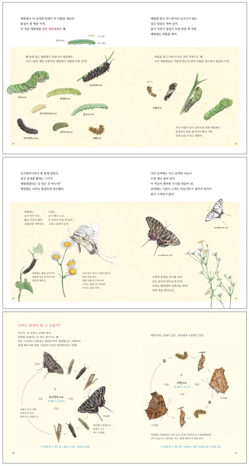 풀밭에 사는 아홉 마리 나비의 한 살이 과정을 담아낸 그림책 『애벌레가 들려주는 나비 이야기』. 이 책은 풀과 애벌레, 천적과 애벌레 등 생태계와 자연과의 관계를 싱싱한 생태 그림으로 보여주고 있다. 알부터 성충까지 나비마다 생김새도 다르고, 애벌레의 먹는 풀도 다르며, 천적을 피하는 법도 모두 다를지라도 생태계와 자연이 맺고 있는 밀접한 관계를 발견하도록 이끌어준다.