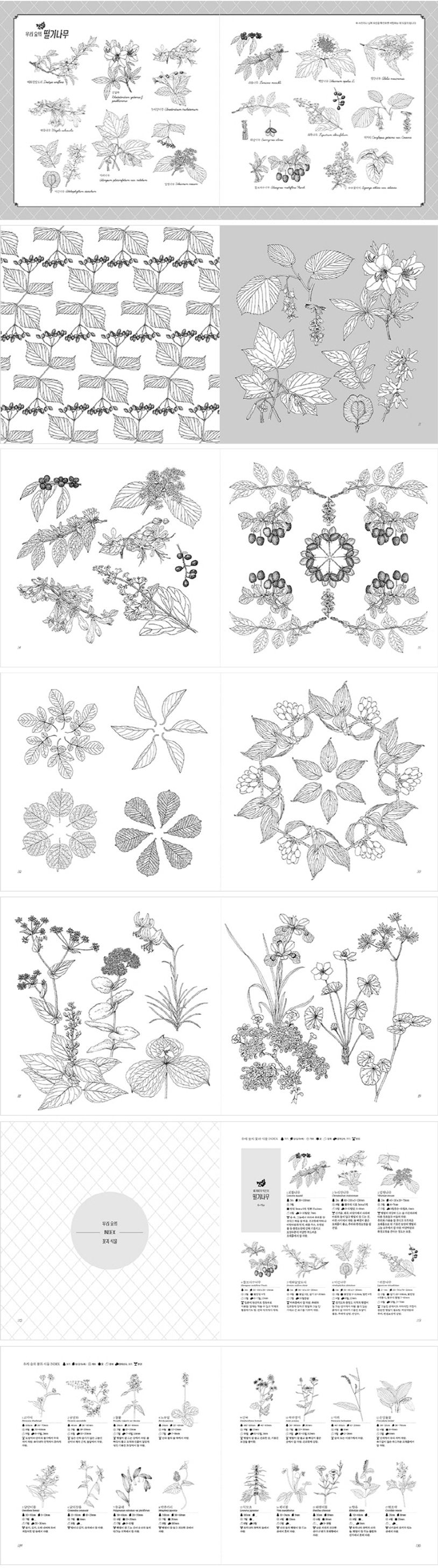 꽃과 식물에 관한 세밀화들을 모아 만든 컬러링북『우리 숲의 꽃과 식물 도감 컬러링북』. 이 책에는 야생화와 각종 나무, 멸종위기식물까지 총 11개의 장으로 나누어 174종의 식물이 실렸다. 책의 뒷부분에는 각 식물의 생육 정보도 함께 수록되어 우리 숲의 생태에 대한 공부도 함께할 수 있다.