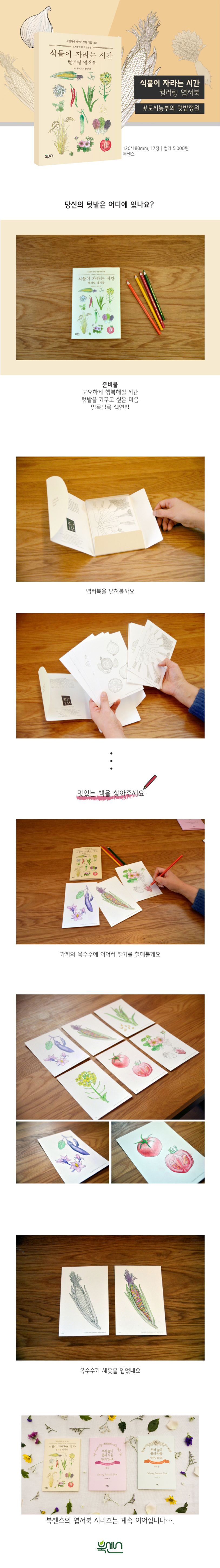 상추, 오이, 토마토, 고추 등 텃밭에서 자라는 16가지 작물의 그림이 담긴 엽서북 이다. 이 그림들에 색을 칠하는 동안 눈과 마음은 풍요롭게 된다. 식물의 색을 채우고 바라보며 완성하는 과정은 씨앗을 심고, 싹이 나고, 식물이 자라 열매를 맺는 데 드는 시간만큼 기다림이 필요하다. 색연필로 밭을 경작하다 보면 어느새 농부의 마음을 닮는다. 2017년 5월 출간된 『식물이 자라는 시간』은 다양한 텃밭 작물의 한해살이를 컬러링북으로 만들어 학교와 도시텃밭 교육에 활용되고 있다. 이 엽서북은 그 중 대표적인 텃밭작물 16가지를 골라 만들었다. 그리고 색칠하며 시작하는 텃밭 체험으로 식물을 이해하고 생명을 아끼는 마음을 갖게 된다.