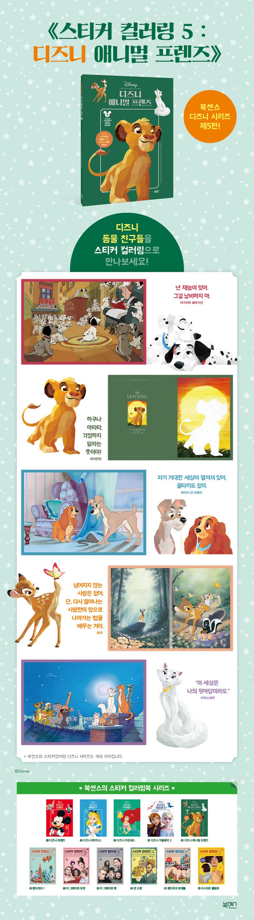 소장가치 100%의 스티커 컬러링북이 출시되었다. 《스티커 컬러링 5: 디즈니 애니멀 프렌즈》에는 101마리 달마시안, 라이언 킹, 레이디와 트램프, 밤비, 아리스토캣 등과 함께 백여 컷의 아름다운 오리지널 이미지들이 한 권에 담겨 있다. 캐릭터 이미지에 색과 양감에 따라 면으로 나누는 폴리곤 아트 기법을 적용했기 때문에 백여 개의 번호를 찾아 스티커를 붙이다 보면 마치 퍼즐을 맞추는 것과 같은 재미와 성취감을 느끼게 된다. 색색의 스티커들을 하나씩 붙여감에 따라 〈디즈니 애니멀 프렌즈〉의 캐릭터들이 내 손끝으로 따라 점차 현실감 있는 모습으로 생생하게 살아나는 쾌감을 만끽해보자. 어느새 그들이 들려주는 재미난 이야기에 푹 빠져 시간이 순식간에 사라지는 짜릿한 경험을 하게 될 것이다. 또한 곱씹을수록 힘이 되는 지혜롭고 다정한 문장들을 따라 책장을 넘기다 보면 자연스럽게 〈디즈니 애니멀 프렌즈〉 친구들과의 추억이 생생하게 소환된다. 자, 이제 복잡한 생각은 잠시 잊자. 우리의 친구, 디즈니가 왔다.