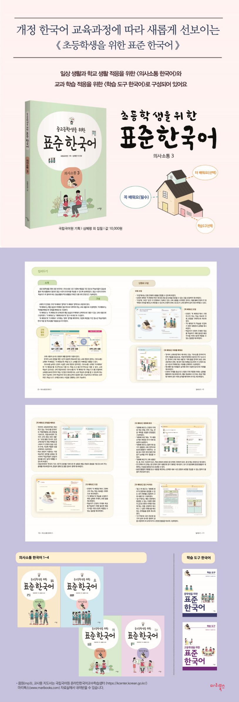 이번에 출간된 《중고등학생을 위한 표준 한국어》 교재는 2017년 한국어 교육과정 개정 고시에 따라 개발된 것입니다. 이 교재는 한국어 능력이 없거나 현저히 부족한 학생이 대상이며, 다양한 수준의 학습자를 고려하여 교재를 선택할 수 있는 ‘모듈화’ 방식을 채택했습니다. 특히 이번 교재는 <의사소통 한국어>와 <학습 도구 한국어>로 나눈 것이 특징입니다. <의사소통 한국어>는 일상생활에 필요한 한국어 의사소통 능력을 기르기 위한 교재입니다. <학습 도구 한국어>는 한국 교과 과정을 잘 따라갈 수 있도록 도와주는 교과 한국어 어휘 등을 배우는 교재입니다.