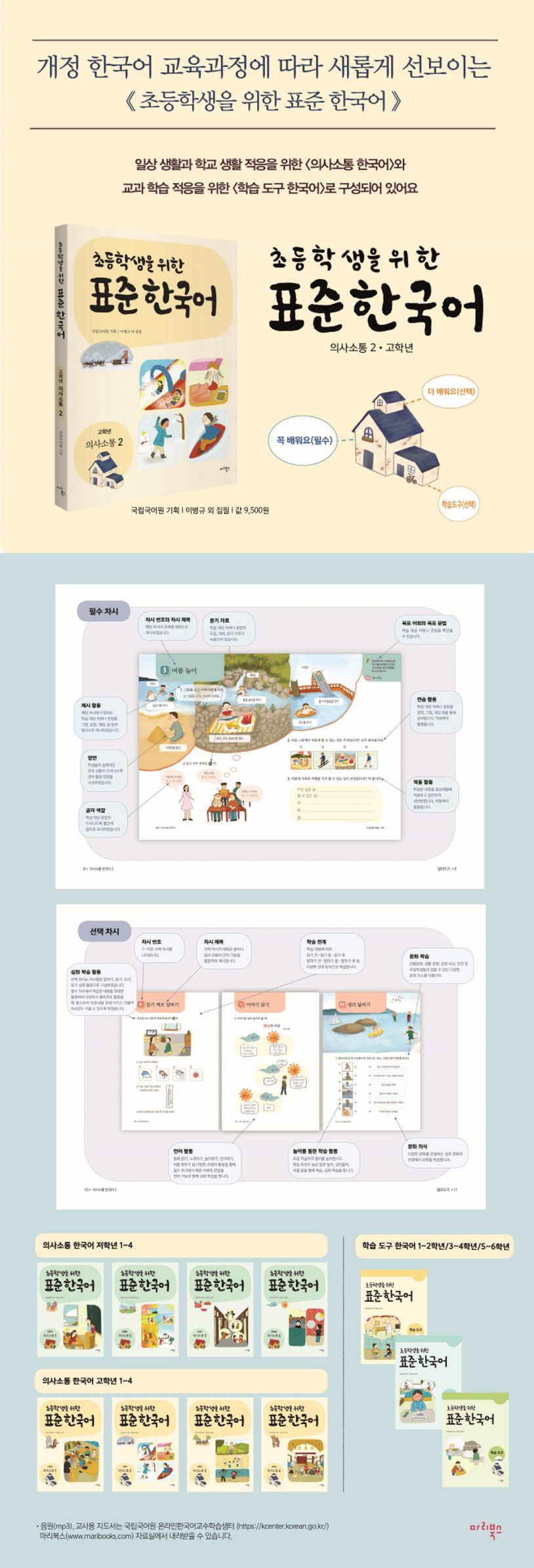 이번에 출간된 《초등학생을 위한 표준 한국어》 교재는 2017년 한국어 교육과정 개정 고시에 따라 개발된 것입니다. 이 교재는 한국어 능력이 없거나 현저히 부족한 학생이 대상이며, 다양한 수준의 학습자를 고려하여 교재를 선택할 수 있는 ‘모듈화’ 방식을 채택했습니다. 특히 이번 교재는 <의사소통 한국어>와 <학습 도구 한국어>로 나눈 것이 특징입니다. <의사소통 한국어>는 일상생활에 필요한 한국어 의사소통 능력을 기르기 위한 교재입니다. <학습 도구 한국어>는 한국 교과 과정을 잘 따라갈 수 있도록 도와주는 교과 한국어 어휘 등을 배우는 교재입니다.