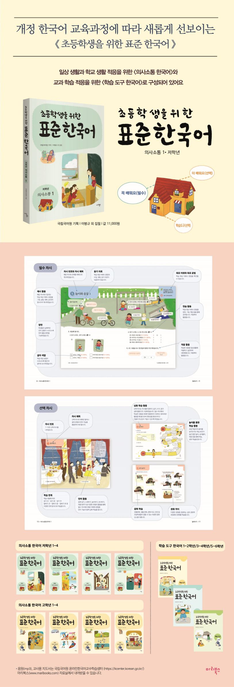 이번에 출간된 《초등학생을 위한 표준 한국어》 교재는 2017년 한국어 교육과정 개정 고시에 따라 개발된 것입니다. 이 교재는 한국어 능력이 없거나 현저히 부족한 학생이 대상이며, 다양한 수준의 학습자를 고려하여 교재를 선택할 수 있는 ‘모듈화’ 방식을 채택했습니다. 특히 이번 교재는 <의사소통 한국어>와 <학습 도구 한국어>로 나눈 것이 특징입니다. <의사소통 한국어>는 일상생활에 필요한 한국어 의사소통 능력을 기르기 위한 교재입니다. <학습 도구 한국어>는 한국 교과 과정을 잘 따라갈 수 있도록 도와주는 교과 한국어 어휘 등을 배우는 교재입니다.
