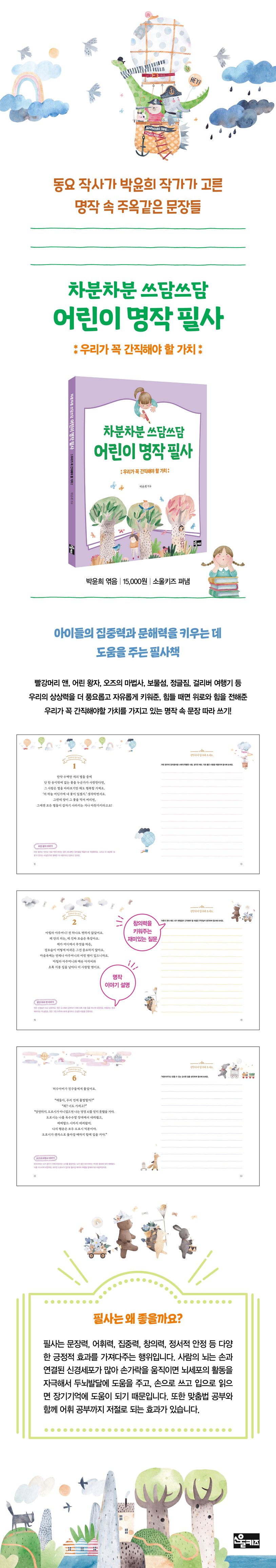 이 책은 수년 동안 100편이 넘는 노랫말을 발표하면서, 작사가와 작가로 활발하게 활동해 온 저자가 아이들이 좋아하는 명작 중 가치 있는 문장들을 뽑아 엮은 필사책이다. 이 책의 아름답고 가치 있는 의미의 단어와 문장들을 꾹꾹 눌러 쓰는 동안 아이들은 따뜻하고 밝은 에너지를 가득 채울 수 있다. 매일매일 필사하는 습관으로 아이들의 마음을 차분하게, 쓰담쓰담 격려해 주는 시간을 가지면 아이들의 집중력과 문해력을 키우는 데 도움이 될 것이다.