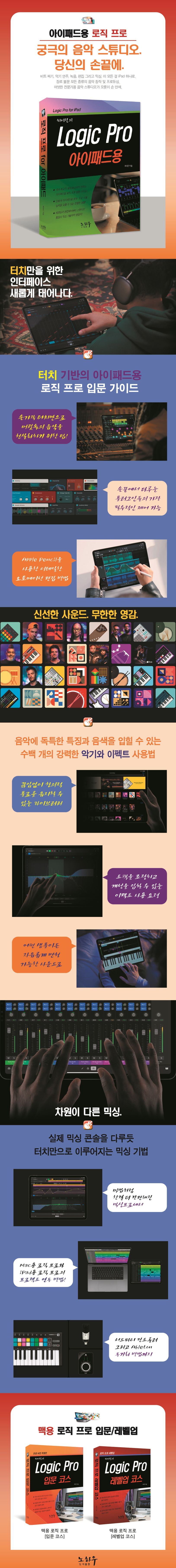 iPad용 Logic Pro는 처음부터 아이패드를 고려해 설계된 Multi-Touch 기반의 인터페이스를 통해 전문적인 작곡, 비트 생성, 녹음, 편집, 믹싱 등의 음악 제작 및 프로듀싱 작업을 손가락 하나로 완성할 수 있는 창작 도구이며, 본서는 이를 혼자서 익히고자 하는 이들을 위한 입문용 가이드입니다.