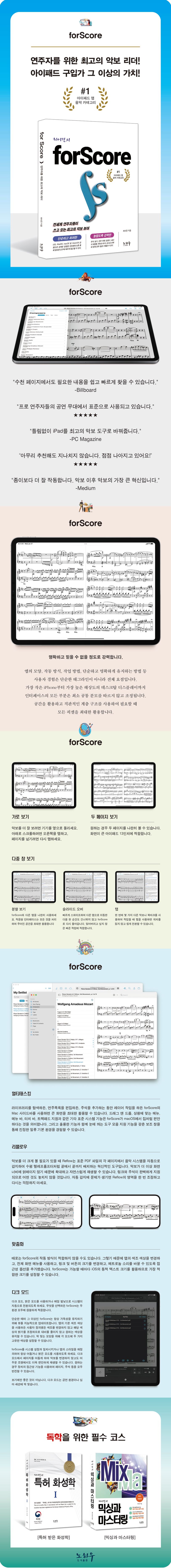 무대 및 버스킹 공연에서 종이 악보를 들고 다니는 연주자는 거의 없습니다. 이미 종이 악보 시대는 끝났다고 보아도 좋습니다. forScore는 오래전부터 전세계 연주자들이 가장 많이 사용하고 있는 아이패드용 악보 리더 앱이며, 본서는 이를 효과적으로 활용할 수 있는 모든 기능을 상세히 다루고 있습니다.