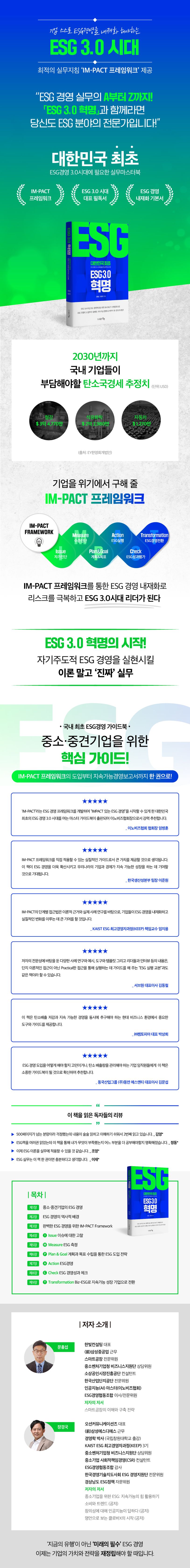 이 책은 대한민국 최초로 중소·중견기업이 ESG 경영의 A부터 Z까지 실질적으로 수행하는 방법론을 IM-PACT 프레임워크로 제시하는 실무자용 완벽 가이드북이다.