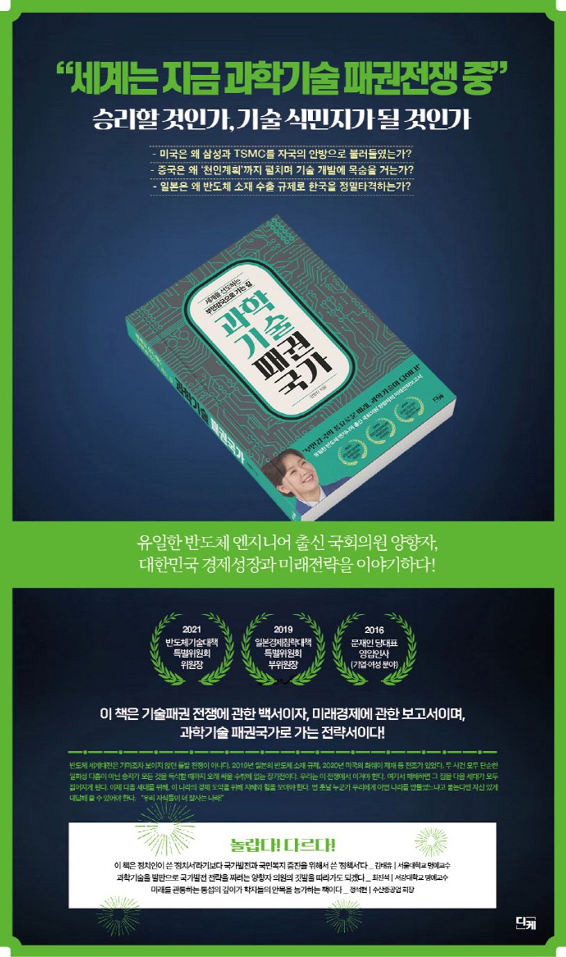 최초의 반도체 엔지니어 출신 국회의원 양향자가 전하는 대한민국 미래전략보고서. 지난 2019년 발생한 일본발 반도체 소재 수출 규제 사건, 2021년 차량용 반도체 수급 문제로 불거진 미·중 반도체 갈등 속에 숨은 역사적·기술적·경제적 원인과 향후 이 갈등이 대한민국을 어떤 상황으로 몰고 갈지 그 현상과 전망을 담았다.