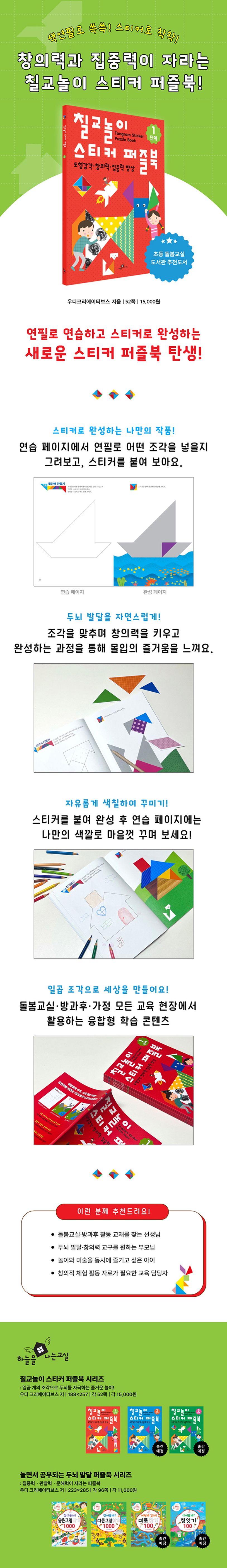 『칠교놀이 스티커 퍼즐북』은 아이들에게 친숙한 그림 그리기와 스티커 붙이기를 결합한 창의 활동 퍼즐북입니다. 정사각형을 일곱 조각으로 나누어 다채로운 모양을 만드는 ‘칠교놀이’에서 영감을 받아 기획된 퍼즐북으로, 미술 활동과 퍼즐 활동을 한 권으로 즐길 수 있습니다. 다양한 도형을 완성하는 과정을 통해 아이들은 놀이의 즐거움을 넘어 몰입과 성취의 기쁨을 느낍니다. 놀이와 학습, 미술과 퍼즐을 결합한 융합형 교육 콘텐츠로서 『칠교놀이 스티커 퍼즐북』은 방과 후 교실, 돌봄 교실, 가정 등 모든 교육 현장에서 아이들의 집중과 성장을 돕는 최적의 책으로 새로운 교육 놀이의 장을 열어 줄 것입니다.