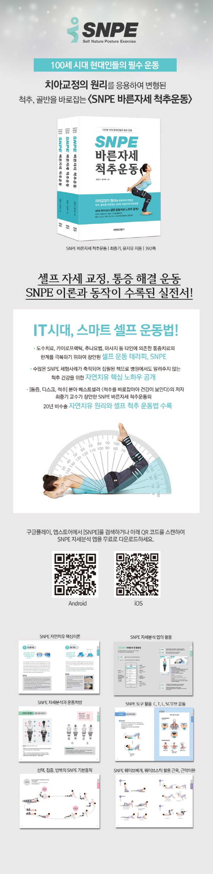 각종 지병에 고생하는 사람들이 건강한 척추를 만들 수 있도록 SNPE 운동을 소개하는 『SNPE 바른자세 척추운동』. 오랜 시간 목과 등, 허리를 숙이고 스마트폰을 사용하고 있는 현대인들은 잘못된 자세 습관 때문에 목, 허리디스크 및 통증으로 고통 받는 사람들이 증가하고 있다. 이러한 현대인들에게 필요한 운동법을 직접 개발하고 대중화 시키는데 앞장서고 있는 저자는 한때 허리 통증 때문에 고시공부를 포기하게 되고 정상적인 사회생활도 할 수 없었다. 그 후 스스로 공부하고 다양한 실험을 통해 만든 운동이 바로 SNPE이다.