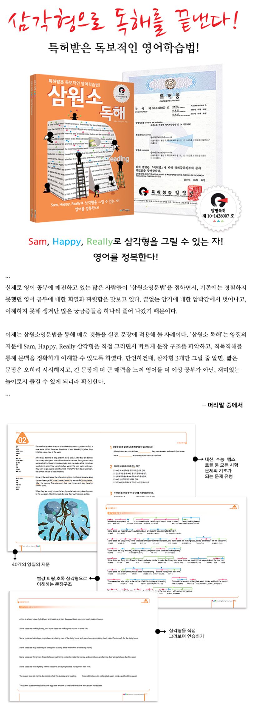 [삼원소 독해]는 특허받은 영어학습법으로 Sam, Happy, Really 삼각형을 직접 그리며 문장 구조를 빠르게 파악하고, 직독직해를 통해 정확한 문맥을 이해를 할 수 있도록 구성된 책이다.