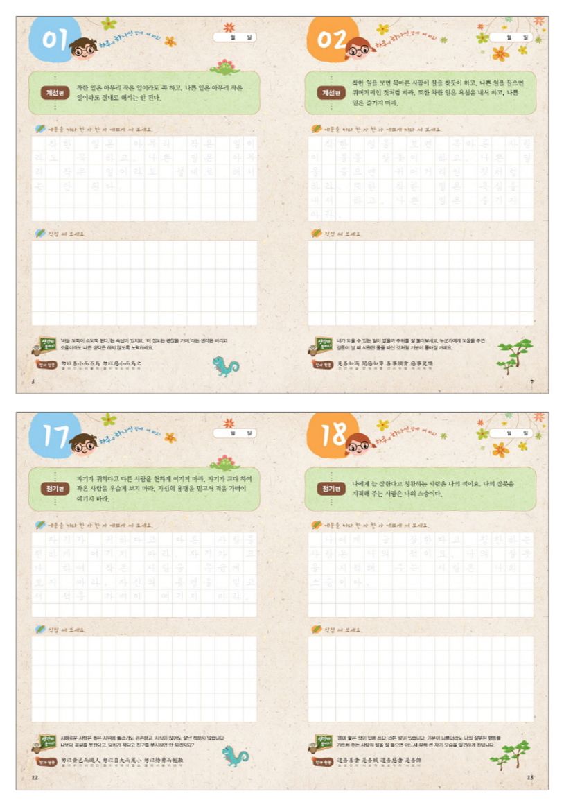따라쓰면서 배우는 『어린이를 위한 명심보감 따라쓰기』. 훌륭한 옛사람들의 말씀을 모은 《명심보감》을 하루에 한 가지씩 따라가면서 잘 이해해나가도록 구성했다. 아랫부분에는 따라쓴 《명심보감》의 내용 중에서 곰곰이 생각해 봐야 할 요점을 알기 쉽게 정리한 '생각해 볼까요?'를 실었다. '한자 원문'도 수록하여 한자 실력도 다질 수 있다.
