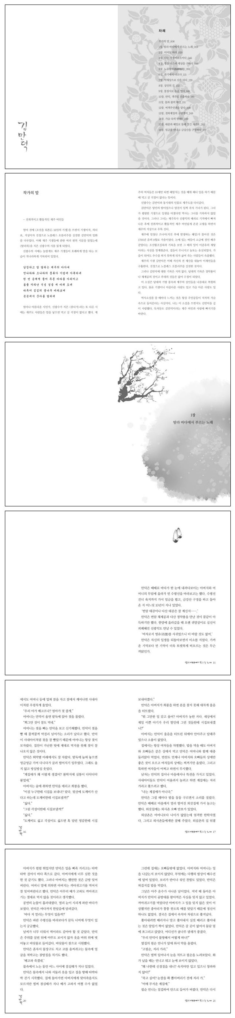 시대의 빛이 된 조선의 새로운 여성상을 만나다『소설 김만덕』. 여인으로서 당연히 가졌던 아름다운 사랑과 가슴 아픈 이별, 그 시대 조선의 기방 풍속과 기생들의 애절한 삶, 거상으로 성장하기 위한 야망과 처절한 경쟁, 그리고 회한을 통해 역사에서 잊힌 김만덕의 삶을 그려냈다. 저자는 드라마보다 더 생생하게 김만덕의 삶은 그려내, 21세기를 살고 있는 우리가 잊지 않고 기억해야 할 조선의 새로운 여성상으로 김만덕을 부활시킨다.