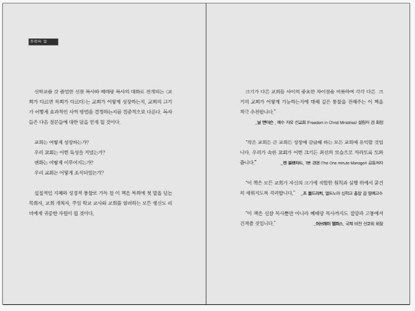 교회 크기에 따라 달라지는 목회와 성장의 법칙『교회가 다르면 목회가 다르다』. 이 책은 신참 목사가 베테랑 목사와 나누는 대화를 통해 교회에 대한 실질적 지혜와 성경적 통찰을 풍부하게 전한다. 교회가 어떻게 성장하는지, 우리 교회는 어떤 속성을 지녔는지, 변화는 어떻게 이루어지는지, 우리 교회는 어떻게 조직되었는지, 교회의 크기가 어떻게 효과적인 사역 방법을 결정하는지를 집중적으로 다룬 이 책을 통해 교회의 크기에 맞게 적합한 원칙과 실행 위에서 효율적 사역 방법을 결정하는 비결을 배울 수 있다.