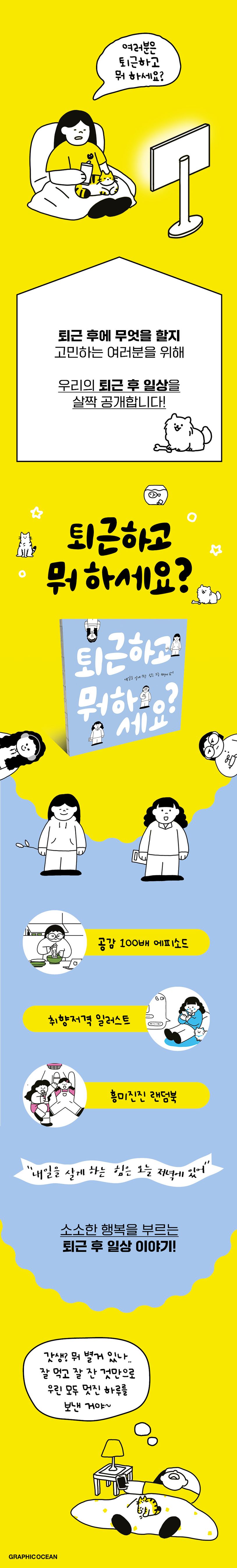 『퇴근하고 뭐 하세요?』는 퇴근 후의 일상을 소개하는 아트북입니다. 같은 회사에 다니지만, MBTI가 다른 아트북의 등장인물 4명은 각자 비슷한 듯 다른 퇴근 시간을 보냅니다. MBTI와 퇴근이라는 일상적인 소재를 활용해 다양한 연령대의 독자와 소통이 가능한 작품입니다. 어느 곳을 펼쳐도 평범한 듯 특별한 우리의 두 번째 일상을 체험할 수 있습니다.