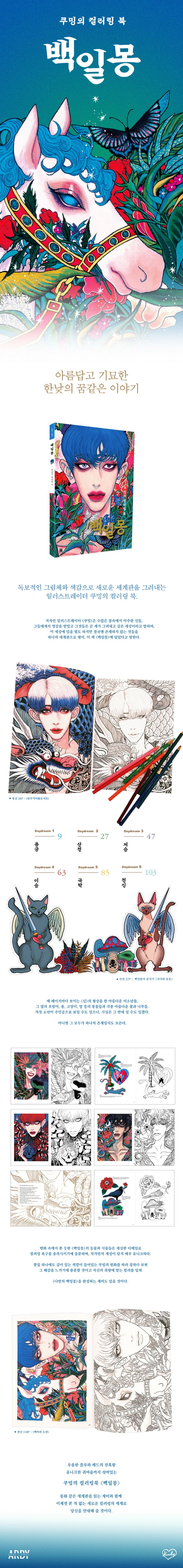 우울한 블루와 레드의 잔혹함, 요소요소 들어 있는 귀여움이 섞여있는 쿠밍의 컬러링북 〈백일몽〉은 그 세계관을 읽는 재미와 함께 집요함으로 다른 생각을 할 수 없는 새로운 컬러링의 세계로 안내해줄 것이다