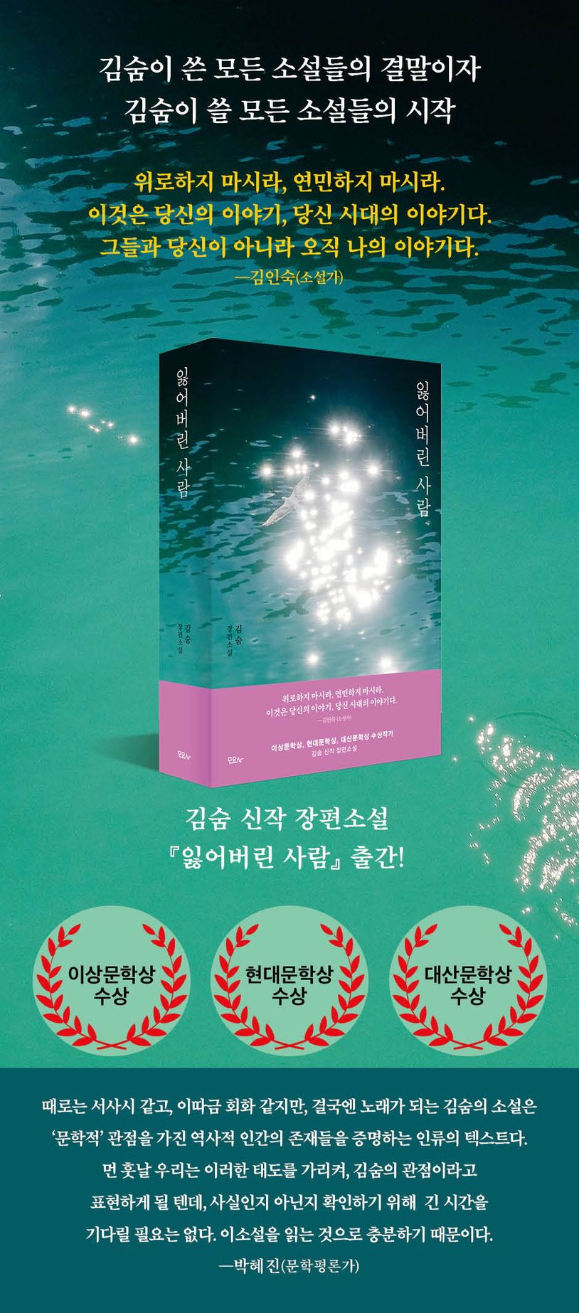 특히이번소설『잃어버린사람』은해방직후부산에서벌어지는소란과난장속에서수많은보통의(혹은익명의)사람들이어떻게살았고어떻게죽었는지,시대와역사의부침을어떻게견디고어떤기억들을담아둔채생명을이어갔는지담담하면서도농밀하게그려내고있다.현실과역사,이둘은결코동떨어져있지않다.여러그물망으로얽혀있다.이소설에서김숨은특유의‘거대한’문학적상상력으로그물코사이로빠져나가는이둘을움켜쥐어바로지금우리앞에펼쳐놓는다.
