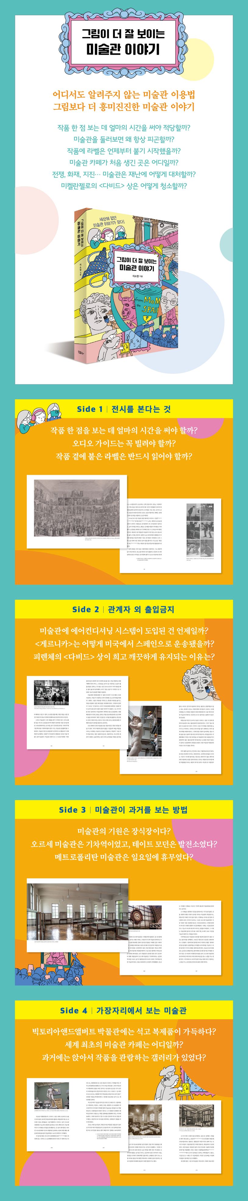 이 책을 쓴 저자는 미술관에 다가갈 수 있는 좀 더 가볍고 유쾌한 방법을 찾아 골몰했다. 온갖 사소한 것에 질문을 던졌고, 한번 호기심이 일자 궁금한 것들이 꼬리에 꼬리를 물고 따라왔다. 그리고 그 사소한 호기심들이 미술관을 구석구석 즐길 수 있는 매력적인 포인트로 다가왔다.