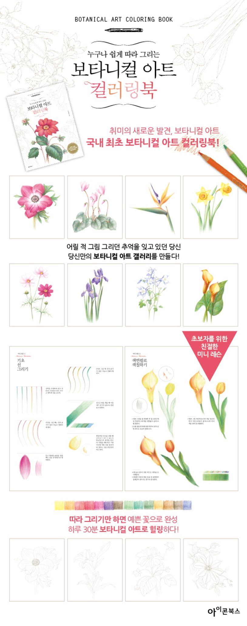 『보타니컬 아트 컬러링북』은 그림에 소질이 없고 서툴다는 이유로 시작하지 못하는 사람들도 쉽게 따라할 수 있도록 구성됐다. 보타니컬 아트(Botanical Art)는 꽃을 비롯해 모든 식물을 소재로 아름답게 그리는 것이다. 보타니컬 아트를 처음 시작하는 사람들이 쉽고 재미있게 밑그림을 따라 그리기만 해도 완성할 수 있도록 미니 레슨, 원본 그림과 밑그림으로 구성해 놓았다.