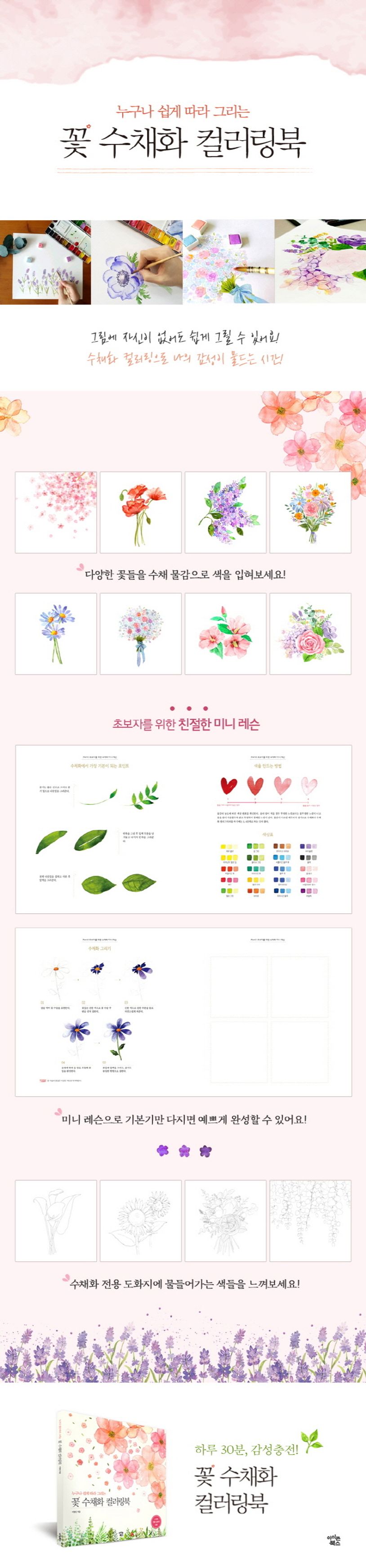 사랑스럽고 따뜻한 그림으로 인스타그램에서 큰 인기를 얻고 있는 이명선 작가의 수채화 가 컬러링북으로 탄생했다. 이 책은 맑고 투명한 수채화를 보며 그려보고 싶다고 느꼈던 다양하고 예쁜 꽃들을 직접 컬러링할 수 있도록 구성했다. 꽃잎과 나뭇잎부터 시작해 꽃다발, 부케, 리스까지, 그림에 소질이 없어도 자세한 설명이 없어도 미니 레슨을 통해 간단한 수채화 그리기 방법만 익히면 누구나 쉽게 그릴 수 있다. 종이도 수채화 전용 도화지를 사용해 붓과 수채물감만 준비하면 곧바로 시작할 수 있다.
