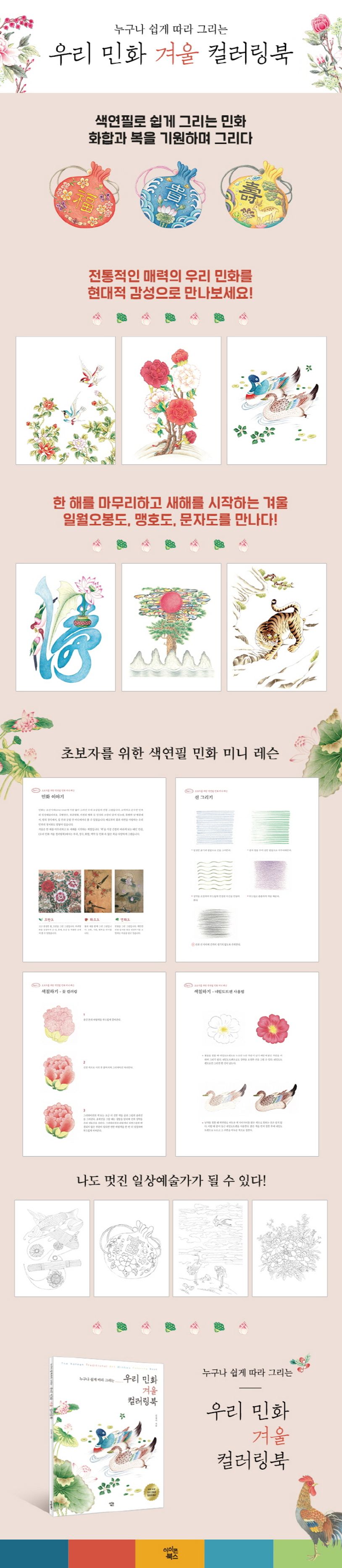 청량하고 생동감 넘치는 《우리 민화 여름 컬러링북》에 이어 독자들의 따스한 겨울과 복을 기원하며 두 번째로 선보이는 민화 컬러링북이다.