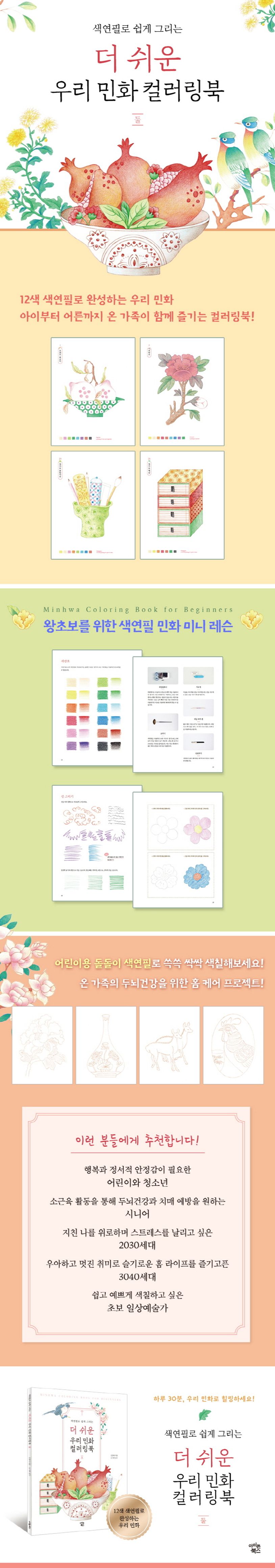 더 쉽고 더 편하게 따라 그리는 《더 쉬운 우리 민화 컬러링북 하나》에 이어 두 번째 컬러링북이 나왔습니다. 최소한의 색연필로 다양한 색상을 만들어 곱디고운 색감의 민화를 그릴 수 있도록 구성되어 있으며, 큼직큼직한 그림들로 다소 쉽게 느껴질 수 있지만 그것이 이 책의 특징으로 아이부터 어르신에 이르기까지 많은 사랑을 받고 있는 시리즈입니다. 재료 준비의 부담감과 번거로움을 한층 낮추고 접근성을 높이기 위해 어린이용 색연필의 기본 12색만 이용해 그림을 완성했습니다. 이 책에서 독자들은 기본 12색만으로도 얼마나 다채로운 색상 표현이 가능한지 직접 확인해볼 수 있습니다.