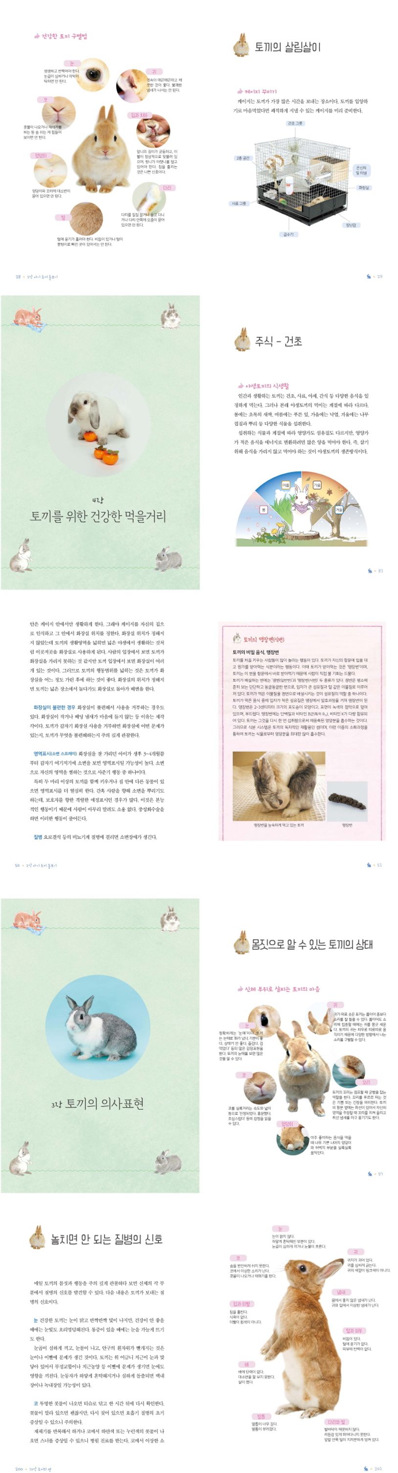 토끼의 습성·식단·행동·감정·놀이·질병 등 모든 것을 담은 토끼 대백과. 토끼의 습성부터 질병까지 모든 것을 담은 토끼 대백과이다. 아직도 토끼는 스트레스에 약해서 잘 죽는 동물이라고 알고 있는 사람이 많지만 토끼에 대해서 잘 모르는 사람들이 제대로 돌봐주지 못해서 생긴 오해이다. 토끼가 스트레스에 약한 것은 맞지만 그 습성에 맞춰서 잘 돌보면 오래 살 수 있다. 반려토끼의 평균 수명은 15살이다. 특히 우리나라는 토끼 진료를 볼 수 있는 동물병원이 많지 않아서 건강에 더 신경을 써야하고, 그러려면 건강에 좋은 먹을거리를 잘 챙겨 먹여야 하고, 토끼가 건강에 문제가 생겼을 때 보내는 신호를 바로 알아챌 수 있어야 한다.