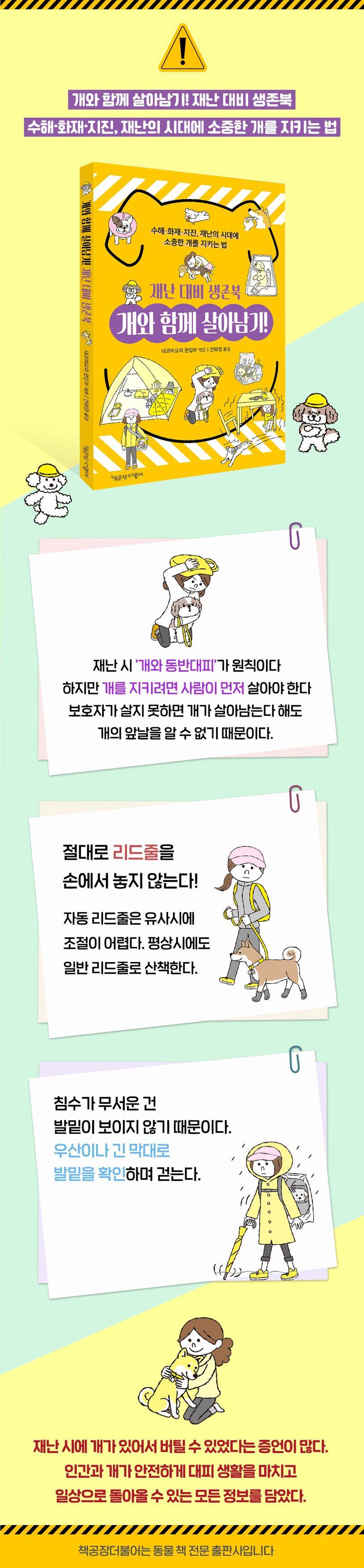 대피 생활은 대피소에서만 하는 것이 아니다. 사람은 대피소에 있고 개는 집에서 돌보는 게 개에게 좋을 수도 있다. 사생활이 보장되는 차나 텐트에서 개와 함께 대피 생활을 할 수도 있다. 사전 대비부터 재난 시 행동 요령, 대피 생활까지 인간과 개가 안전하게 대피 생활을 마치고 일상으로 돌아올 수 있는 모든 정보를 담았다.