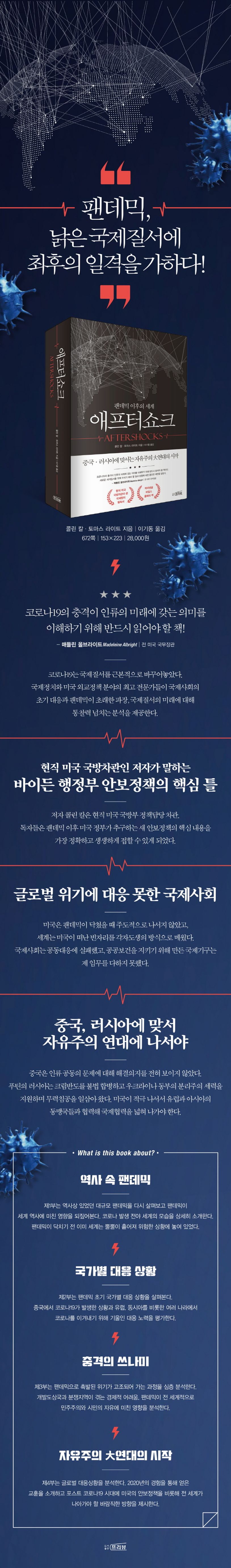 코로나19는 국제질서를 근본적으로 바꾸어놓았다. 이미 사양길에 접어들어 있던 낡은 국제질서의 여러 문제점을 적나라하게 드러내 보여주었다. 이 충격이 인류의 미래에 어떤 의미를 갖는지 이해하기 위해 반드시 읽어야 할 책이다. 저자들은 국제정치와 미국 외교정책 분야의 최고 전문가들로 팬데믹이 초래한 파장과 국제질서의 미래에 대해 통찰력 넘치는 분석을 제공한다. 저자 콜린 칼은 미국 국방부 정책담당 차관으로 2021년 4월 현직에 임명됐다. 미국 정부가 한국을 포함한 우방과 동맹국을 상대로 파트너십을 구축하고 국방 분야의 협력이 원활하게 이루어지도록 조정한다. 이 책을 통해 독자들은 팬데믹 이후 미국이 추구하는 새 안보정책의 핵심 내용을 가장 정확하고 생생하게 접할 수 있게 되었다.