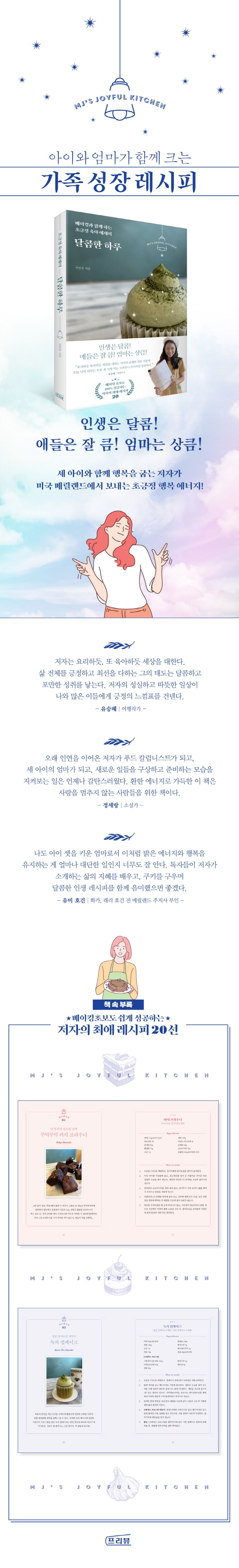 저자는 미국에서 세 아이를 키우는 평범한 주부이다. 그러면서 음식 칼럼니스트, 케이크 디자이너, 파티시에, 사업가, 블로거, 유튜버 등의 다양한 명함을 스스로 만들어가며 긍정적인 에너지를 마구 내뿜는 유쾌한 엄마이다. 자신이 겪은 크고 작은 일상에서 삶의 지혜가 반짝이는 짧은 에세이를 맛깔스레 요리해 책에 담았다. 블로그에 소소한 일상을 기록해 온 게 햇수로 10년이 더 넘었고 꽤 많은 구독자가 생기며 활동 영역을 넓혀가고 있다. 거의 매일 블로그에 무언가를 올리는데, 지나가다 발견한 예쁜 꽃이나 신기한 곤충 사진을 올리기도 하고, 여행지에 대한 글과 사진을 올릴 때도 있다. 만들어 먹은 음식과 레시피도 지나간 세월만큼 수북이 쌓였다.
