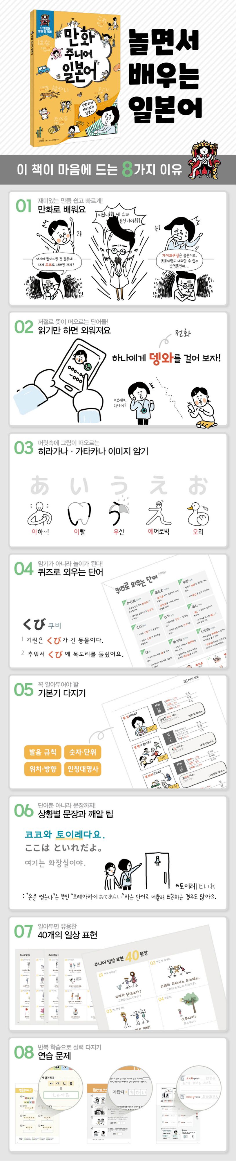 〈만화 주니어 일본어〉는 일본어를 처음 배우는 학생들에게 최적의 교재다. 이 책은 지루한 문법 위주의 교재가 아니다. 퀴즈를 이용한 만화를 중심으로, 일본어를 가장 재미있고 빠르게 배울 수 있게끔 만들어졌다. 이 책과 함께라면, 어렵고 지루한 외국어 공부도 '즐거운 놀이'가 된다. 재미있는 일만큼 빨리 익히게 되는 일은 없다. 재미가 있으면, 능동적이고 적극적으로 받아들이게 되기 때문이다. 〈만화 주니어 일본어〉와 함께, 놀면서 일본어와 친해져 보자!