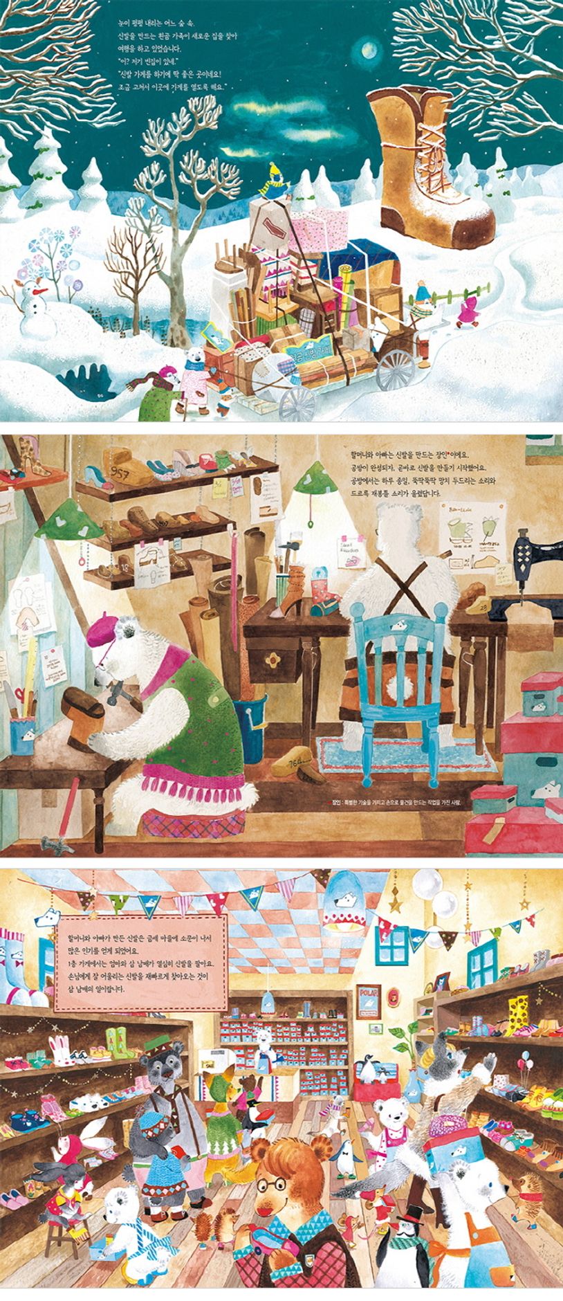 1층은 신발을 파는 가게, 2층과 3층은 가족이 생활하는 집, 4층은 신발 창고, 그리고 제일 꼭대기 5층의 다락방은 신발을 만드는 공방이었다. 공방이 완성되자, 신발 장인인 할머니와 아빠는 곧바로 신발을 만들었고, 엄마와 삼 남매는 열심히 신발을 판매했다. 흰곰 신발 가게는 늘 북적북적 손님들로 넘쳐났다. 동물들이 가진 단점이나 고민을 마치 다 알고 있었다는 듯, 각 동물들에게 꼭 알맞은 맞춤 신발을 내놓았기 때문에 마을에 소문이 나서 많은 인기를 얻게 되는데…….