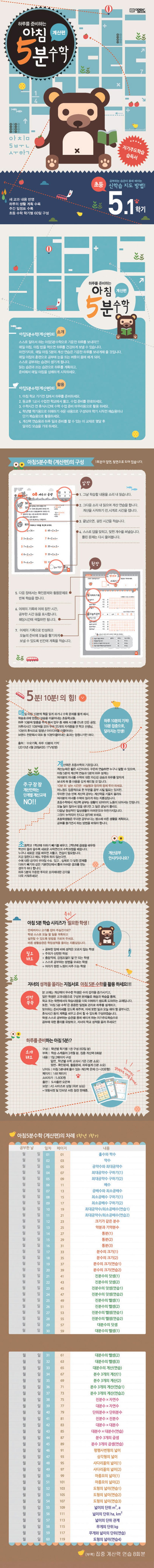 본 교재는 계산력이 우수한 학생은 수의 감각을 증가시키고, 일반학생은 교과내용으로 구성된 문제들로 예습과 복습을 통해, 학교와 학원에서의 학습내용을 더욱 이해하기 쉽도록 도와주는 교재입니다. 또한 ‘아침5분수학’은 꼼꼼한 일정표 관리로 하루를 설계하고, 맞이하는 준비자세를 갖도록 해주며, 어제 못한 일과 오늘 해야할 공부시간, 휴식시간등을 계획을 세우고 준비 할 수 있도록 구성하였습니다. 학생 스스로 공부하는 습관을 몸에 베이게 하는 자기주도학습으로 공부에 대한 흥미를 유발하고, 자녀의 학교 성적을 올려주세요!!!