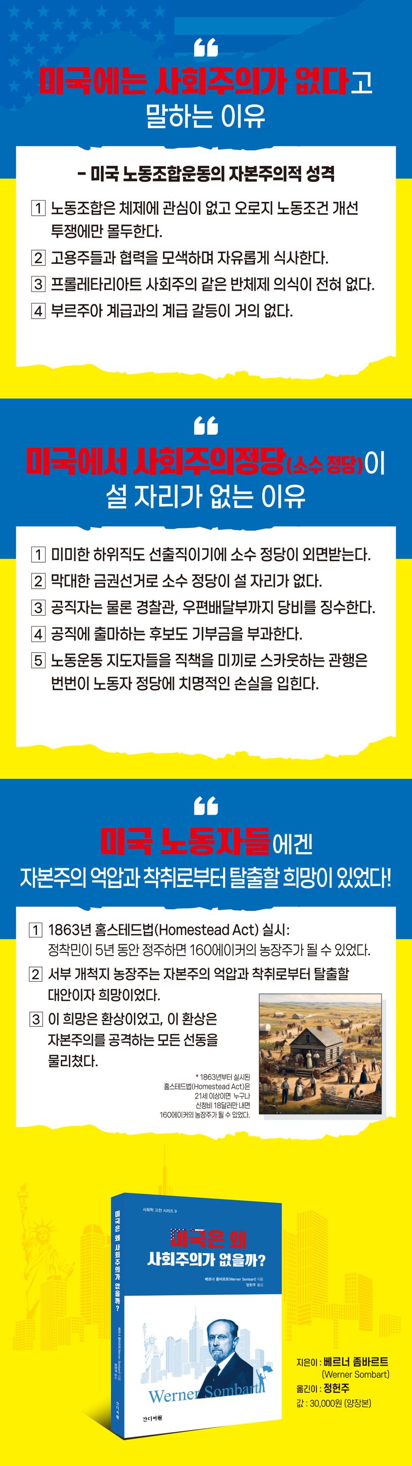 미국은 자본집중이 심화되고 사회적 불평등이 가속화되어 자본주의 세계의 대격변이 임박한 사회다. 비슷한 조건의 유럽이라면 파업과 시위가 빈번하고 사회주의 노동운동이 활발하겠지만, 그러나 유럽과 달리 미국엔 자본주의의 대안으로 모색되는 사회주의가 인기가 없다. 왜 그럴까?