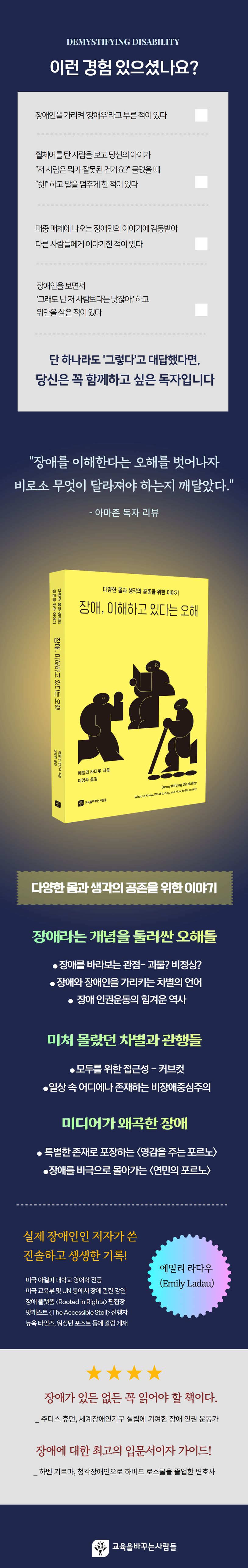 오랫동안 장애는 중대한 결함이나 불행으로 취급되어 왔다. 역사 속에서 장애는 괴물로 여겨졌고 미디어는 돈벌이 수단으로 이를 악용했다. 하지만 이는 명백한 오해이고 그릇된 편견이다. 장애는 특별한 누군가의 이야기가 아니다. 전 세계 인구 중 10억 명 이상이 장애를 겪고 있으며, 누구든 일시적이거나 영구적인 장애를 경험할 수 있다. 그렇기에 이 책은 장애인을 위한 책이 아니라, ‘모두를 위한 책’이다.