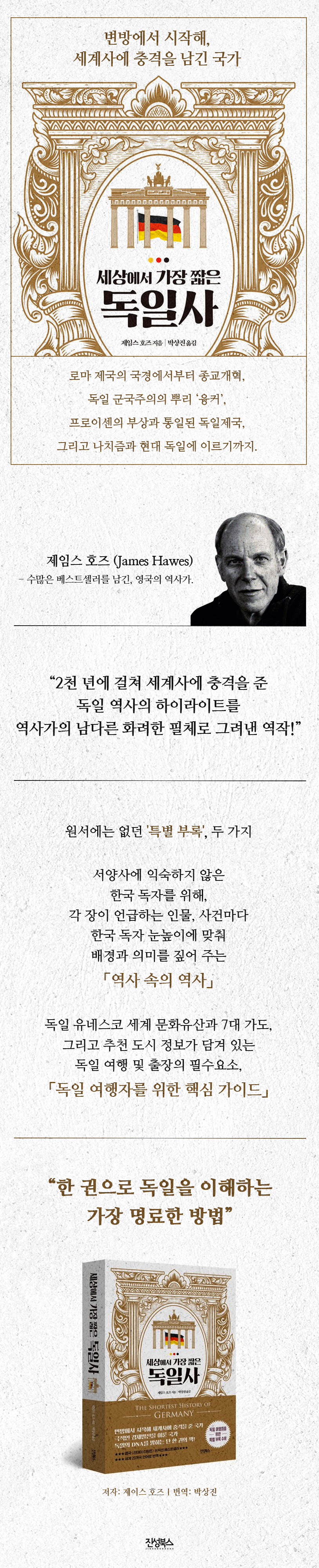 『세상에서 가장 짧은 독일사』는 야만과 이성, 민주주의와 군국주의, 공존과 배제, 절제와 탐욕까지, 상반된 개념들이 뒤섞인 독일사의 본질을 냉철하게 파헤치고 있다. 고대 유럽을 지배했던 로마제국을 파괴하는 데 일조하면서, 한편으로 그들이 빛나는 그리스, 로마의 지적 유산의 복원에 어떻게 기여했는지 집어준다. 나아가 종교개혁, 프랑스와의 대결, 세계대전, 분단과 통일까지 많은 역사적 주요 이정표를 면밀하게 검증하고 가차 없이 역사가로서의 메스를 가한다.
