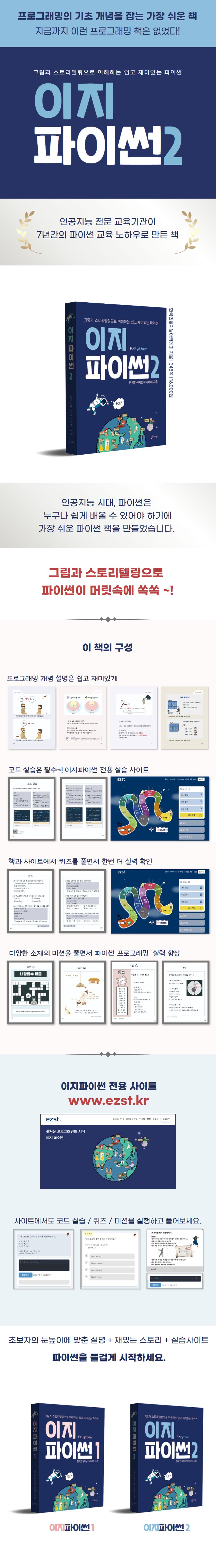 www.ezst.kr에 로그인하면 사이트에서 바로 예제 코드를 직접 연습하고 즉각적인 피드백도 받을 수 있으며, 각 장마다 퀴즈를 통해 더 많은 코드를 접하면서 실력을 점검할 수 있도록 합니다. 또한, 각 장의 마지막에는 재미있는 스토리를 기반으로 만든 미션도 제공하여, 파이썬 학습을 더욱 재미있게 만듭니다.