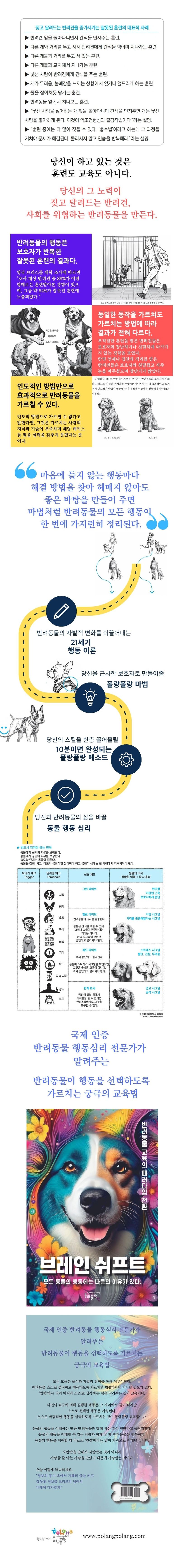 마음에 들지 않는 행동마다 해결 방법을 찾아 헤매지 않아도 좋은 바탕을 만들어 주면 마법처럼 반려동물의 모든 행동이 한 번에 가지런히 정리된다. 더 이상 문제에 끌려다닐 필요가 없다. 그것이 저자가 말하는 패러다임 전환, 브레인 쉬프트다.