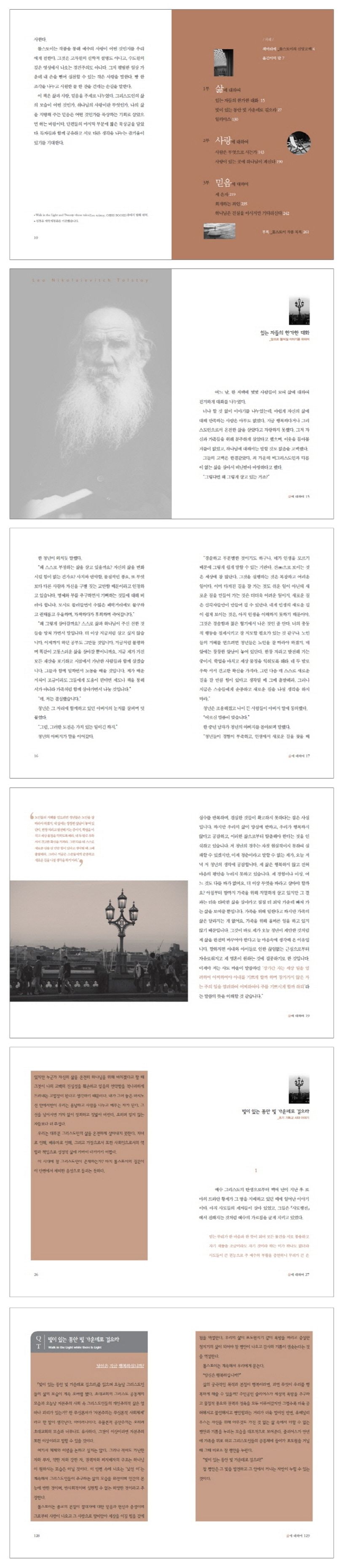 『톨스토이 단편집: 빛이 있는 동안 빛 가운데로 걸으라』는 영혼의 기쁨과 삶의 본질에 대한 신앙 고백 8편을 엮어 구성한 책이다. 저자 자신의 영적 방황과 기독교에 회심을 그린 자전적 소설이 주를 이루며, 사랑의 결핍과 행복 등을 이야기한다. 그리스도의 진리를 있는 그대로 담아내고 의혹이 없는 가르침이 어떻게 삶에 적용되는지 전하고 있다. 더불어 현대 교회와 그리스도인들의 결핍과 회복을 위해서는 ‘사랑’만이 그 해답이 될 수 있다고 조언했다.