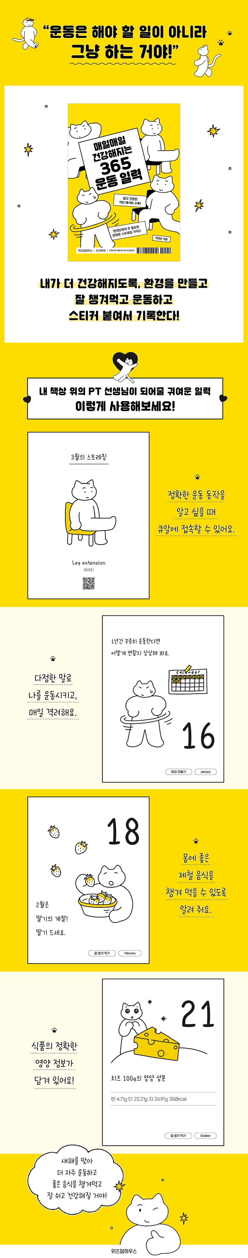 운동 해야지, 생각은 하지만 일상에 치여 시간도 공간도 없는 우리를 위한 일력이 탄생했다. 앉은 자리에서 그대로 따라한다면 일주일에 두 번은 저절로 운동하고 매월 제철 음식의 영양 성분을 알고 챙겨 먹으며 틈틈이 나의 마음까지 돌볼 수 있게 될 것이다. 부록인 연력 포스터를 벽에 붙여두고 다양한 컬러의 스티커를 붙이며 1년 동안 내가 얼마나 어떻게 운동을 했는지도 한눈에 들어오게 기록할 수 있다. 책상 위에 올려두고 매일 한 장씩 넘기며 따라하기만 되는 〈365 운동 일력〉이 당신의 몸과 마음이 같이 건강해질 수 있도록 돕는 나만의 PT 선생님이 되어줄 것이다.