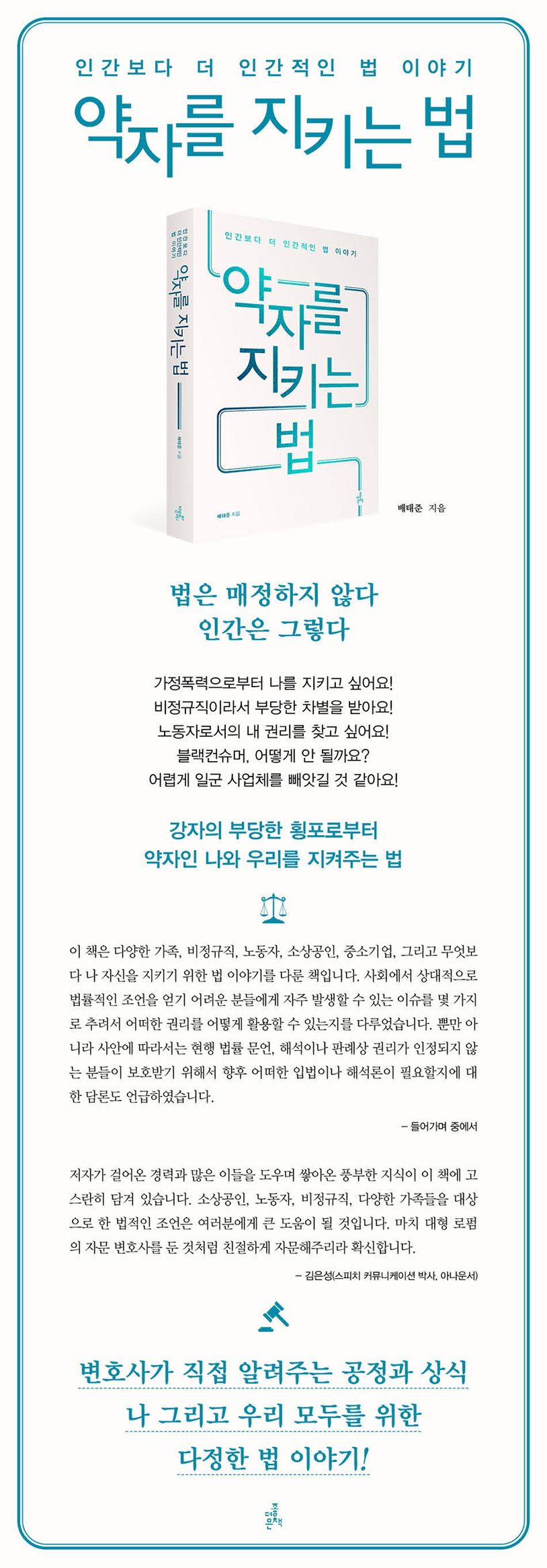 이렇게 공정함에 대한 믿음이 흔들리는 시기에 법을 바라보는 시선을 바꿔줄 책 『약자를 지키는 법』이 출간되었다. 저자 배태준은 대형 로펌에서 활동하면서 한편으로 네이버 카페를 통해서 수많은 인생 고민을 아무 대가 없이 상담해주던 특이한 변호사로 알려져 있다. 저자는 이 책을 통해 우리가 미처 알지 못했던 약자를 지켜주는 법 조항과 그것을 활용하는 방법에 대해서 이야기한다. 그리고 궁극적으로 그런 법에 담긴 ‘따뜻한 마음’을 재조명한다.