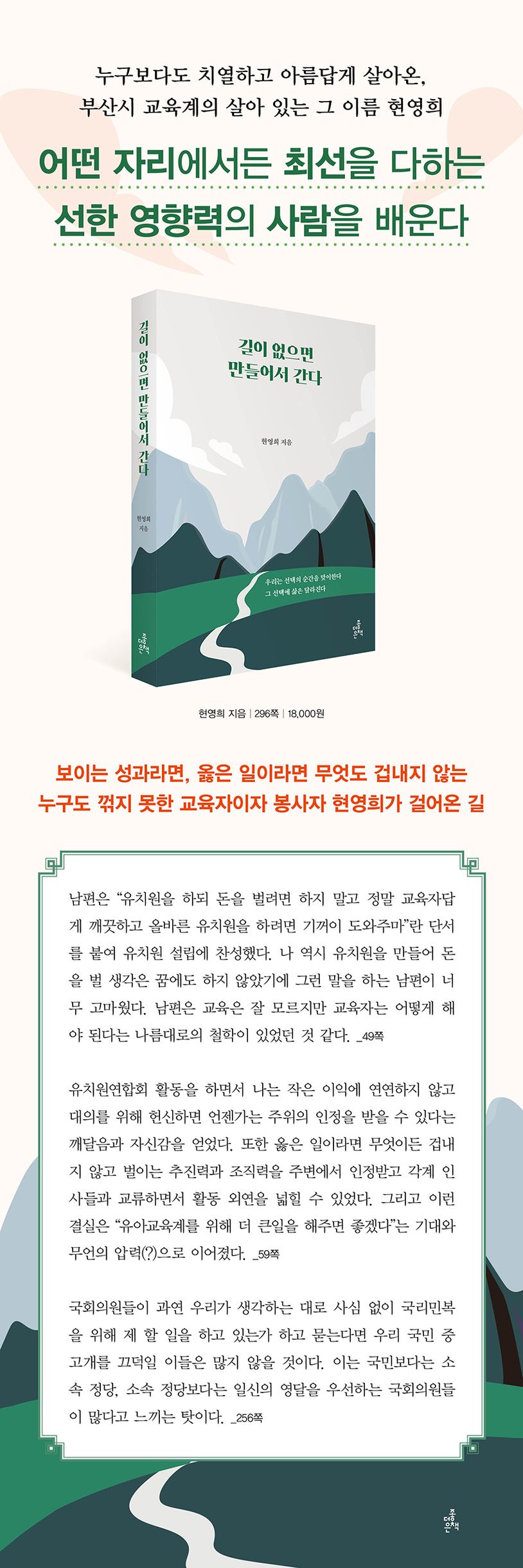 그렇게 교육자로서 작은 이익에 연연하지 않고 대의를 위한 헌신은 그를 정치라는 무대로 이끌었다. 그러나 국회의원이 되자마자 찾아온 시련은 평생을 바쳐온 유치원의 페업이라는 엄청난 아픔도 가져왔다. 그럼에도 아무도 꺾지 못한 교육자·봉사자로서의 여정과 사회사업, 고향에 대한 사랑으로 걸어온 여정을 이 책에서 같이 걸어보기를 권한다.