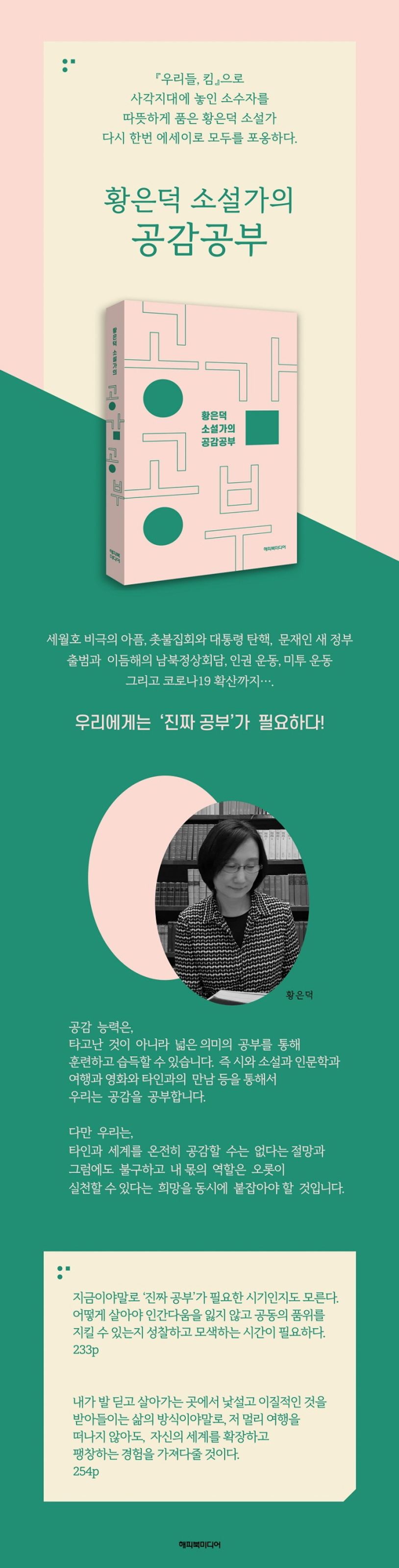 ▶공감은힘이세다세월호비극의아픔,촛불집회와대통령탄핵,문재인새정부출범과이듬해의남북정상회담,인권운동과미투운동,그리고코로나19확산까지….현시대를읽는작가의안목과성찰이글마다녹아있다.작가는이러한기록의과정속에서삶의방향성을찾는시도를하고,공감을공부하기위해부단히노력한다.그리고독자들에게공감능력을배우고실천할수있는길을안내한다.이책은총6개의부로구성되어있는데,각부에서작가는폭력으로인해고통받는사람들을글로마음으로공감하고,깨어있는시민의식으로권력의타락을막은사례를비평하며,우리한국의문화를타자의시선으로돌아보며무심코지나친한국문화의소중함을다시금생각한다.그리고우리에게필요한‘진짜공부’가무엇인지전달한다.▶벗겨진‘신발한짝’의의미대한민국은(왕정이아니라)민주공화국이며,주권과권력은(대통령이아니라)국민에게있다는당연한명제를소리높여외치는이유.그것은격랑의시대를살고있는우리가국가의근본이념을되새김으로써민주주의에대한희망의끈을놓지않고자하기때문이다.-「역모가민의가되기까지」중에서1987년이한열열사의죽음,그현장에있던한짝의운동화와2016년검찰청사로향하던최순실이남긴한짝의명품신발.이두사람이남긴신발은각각의시대와역사를대변한다는공통점을가진다.한켤레의신발에공명하는작가의시선을만나보자.책의2부에서는이와같은우리나라권력의역사를김숨소설가의『L의운동화』,촛불집회와이문열소설가의『우리들의일그러진영웅』,조지오웰의『동물농장』과『1984』,영화〈택시운전사〉등여러작품을통해재조명하고우리가어떠한시각을가지고민주주의사회에서살아가야하는지돕는다.최근5년동안한국사회를뒤흔들었던사건들을재조명하는작가의글은우리사회가지금까지어떠한방식으로변화하고있는지독자들로하여금다시돌아보게한다.▶‘미안해,사랑해’방식은달라도소중한공감“고통에공감하는방식은제각각다르다.그리고모두소중하다.”오늘,세월호를다시기억한다.진실은여전히물속깊숙이수장되어있고,슬픔은망각과조롱에시달리고있다.-「미안해,사랑해」중에서2014년의세월호사건은우리를가슴시리게만들었다.작가는물속깊은곳에숨어나오지않는그진실을꺼내기위해그곳을열심히헤엄친다.그만의방식으로고통에공감하고있는것이다.여성차별과학대의역사는인류가문화유산을축적해온시간만큼이나유구하다.강남역인근의화장실과수락산등산로에서여성이나타나기만을기다렸던가해자의무의식에여성혐오이데올로기가각인될정도로긴시간이었다.최근발생한일련의사건들은‘약자로서의여성’을목표물로삼았다는점에서사회문화적맥락속에서이해되어야한다.여성과어린이와장애인과성소수자를향해가해져온저유구한폭력의역사적고리를끊어놓을제도적장치와시스템이필요하다.-「‘여성혐오’이데올로기」중에서입양인에대한그의관심도여전하다.이전의『한국어수업』과『우리들,킴』에서부터이어져온입양인과소수자에대한따스한시선은입양에대한편견을바꾸기위해노력하는사람들에게응원과희망의메시지를던진다.그리고‘여성혐오’에대한논의도잊지않는다.특히고전문학에서부터바탕이된여성혐오서사에대해꼬집는그의예리한시선은우리에게익숙한고전을새로운시각으로바라보게한다.▶연대,공존위한공감은공부되어야한다“나혼자잘먹고잘살면그만인세상이아닌것이다.”돈의위력이세상의모든가치와신념을집어삼키는시대가되어버렸다.젊은세대들의주식에대한관심은나날이늘어가고있으며,‘내집마련’이라는꿈이인생의목표가되어버렸다.하지만,나혼자잘먹고잘살면무슨소용인가.작가는지금이야말로어떻게살아야인간다움을잃지않을수있는지성찰하는시간이필요하다고강조한다.‘진짜공부’는어려운것이아니다.독서,여행,대화,만남이모든것이공부하는방법이될수있다.개인용컵을사용하는친구를보고환경을지키는,불편해지는삶의방식을배우고,생각지도못한것에서행복을느끼는사람을보고지금내가행복의조건으로여기는것은무엇인지되돌아본다.국내대학의외국인유학생비율이점점늘어나는최근의추세에타자의고유문화를이해,포용하려는다문화인식을갖추기위해노력하고,알베르까뮈의『페스트』를통해팬데믹을이겨나가는연대와희망의의미를새롭게발견한다.코로나19를헤쳐나가기위해서작가는이렇게‘진짜공부’가필요하다고말한다.코로나19사태는더불어살아가는삶의형태와공존의방식을되짚어보는계기가되고있다.팬데믹은우리사회와인류의오만과편견,제도와정책의빈틈을드러냈다.황은덕소설가는연대와공존의가치를인류와인간이갖춰야할필수덕목으로강조한다.그러기위해공감은공부되어야한다고.