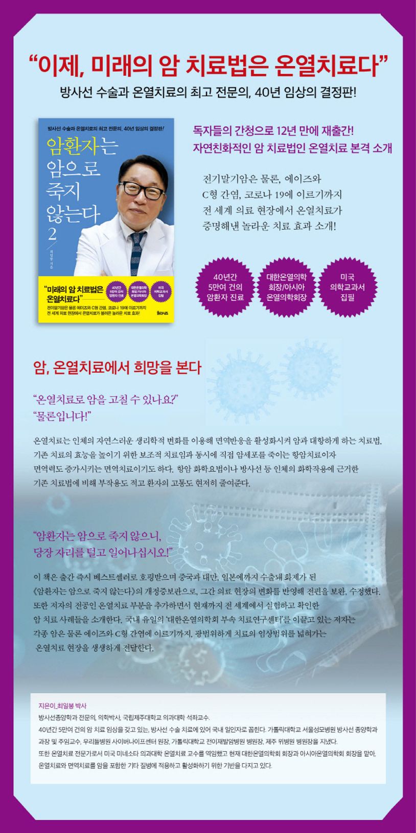 이후 책을 다시 출간해달라는 독자들의 꾸준한 요청에 따라, 그동안 의료현장의 변화를 감안하여 전편의 내용을 보완, 수정해 《암환자는 암으로 죽지 않는다 2》를 출간한다. 특히 이번 책에 추가된 온열치료는 미래의 암 치료법으로 주목받는 자연친화적 치료법으로, 현재까지 전 세계에서 실험하고 검증한 암 치료 사례들이 소개된다. 전이말기암은 물론, 에이즈와 C형 간염, 코로나 19에 이르기까지, 온열치료의 효과는 예상보다 훨씬 광범위하다.