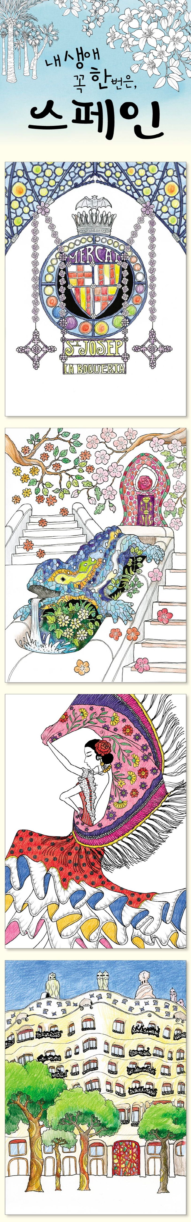 가우디의 도시, 바르셀로나에서 출발하는 컬러링 여행『내 생에 꼭 한번은, 스페인』. 산티아고 순례길, 죽기 전에 한번은 가봐야 한다는 프라도 미술관이 있는 마드리드, 〈백설공주〉의 성으로 유명한 ‘알카사르’가 있는 세고비아, 스페인에서 가장 아름다운 광장 ‘스페인 광장’이 있는 세비아, 알함브라 궁전의 그라나다까지 환상적으로 이어진다. 지중해 도시 말라가에서 커피 한잔을 하며 스페인의 국화 오렌지꽃, 돈키호테와 산초, 프리메라리가 구단 유니폼을 색칠해보는 재미는 덤이다.