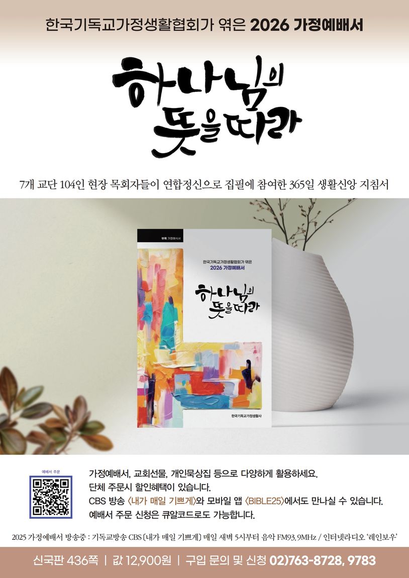 - 2026 가정예배서 주일분은 한남교회 김민수 목사님이 직접 찍은 흑백 사진과 한줄 묵상으로 준비하였습니다. 사진 한 장이 전하는 사색의 여운과 말씀 속 진리가 어우러져, 주일마다 우리의 마음을 차분히 멈추게 하고 영혼을 은혜로 채워줄 것입니다.
