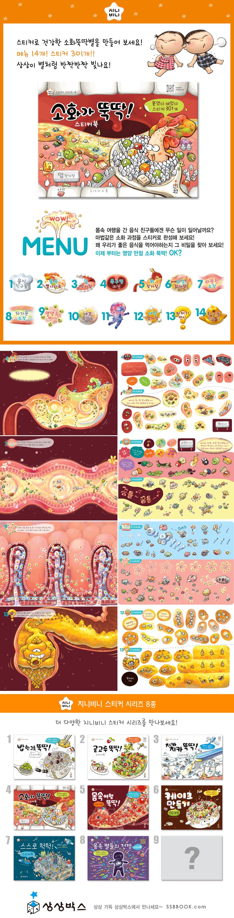 소화가 뚝딱 스티커북에서는 밥숟가락 왕복선을 타고 음식들과 함께 몸속 여행을 떠나게 됩니다. 침분수에 몸을 적시며 해변처럼 뛰어 노는 입 정거장. 커다란 주머니에 바다가 가득 담긴 것 같은 위장 정거장. 길다란 기차가 꿈틀 춤을 추며 영양소로 변신하게 해주는 소장 정거장과 도시를 닮은 수많은 융모 빌딩, 그리고 유산균 요정들이 옹기종기 사는 대장 정거장 등 음식들을 따라 스티커 놀이를 하다 보면 소화과정과 쑥쑥 크는 성장의 비밀을 이해하게 됩니다.