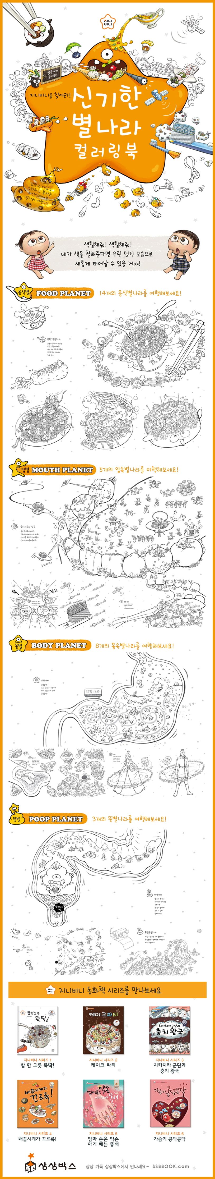 [지니비니를 찾아라! 신기한 별나라 컬러링북]은 지니비니 시리즈의 신기한 별들이 모여 만들어진 컬러링북입니다. 다양한 별나라마다 다른 우주복을 입고 숨어있는 지니비니를 찾아보세요.