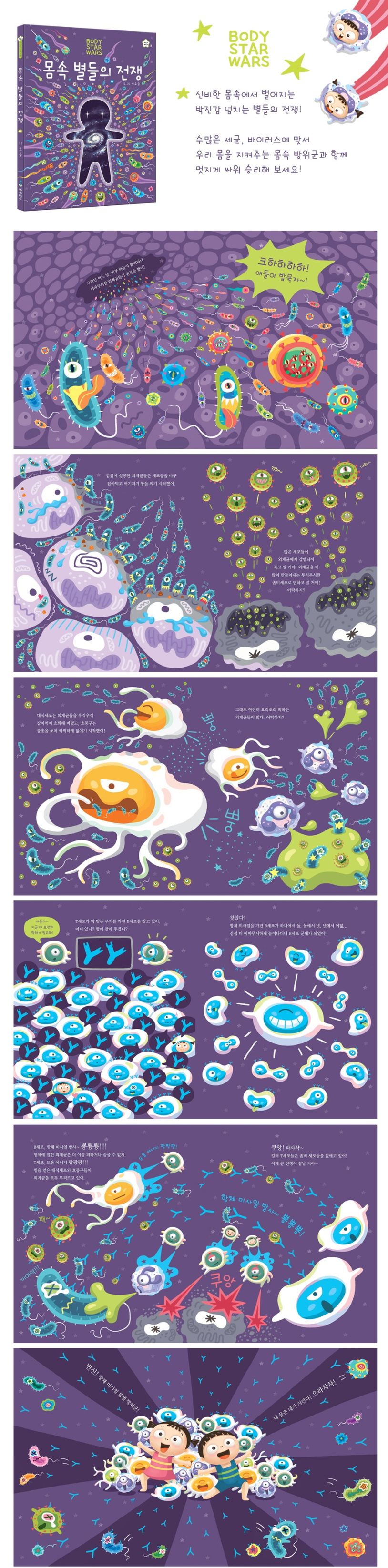 영화 속 멋진 영웅이 나쁜 외계인과 싸우듯이, 백혈구도 우리 몸을 지키기 위해 외계균과 열심히 싸우고 있습니다. 우리 몸 안에서 얼마나 놀라운 일들이 벌어지고 있는지 알게 된다면, 우리 스스로가 얼마나 멋지고 강한지 깨닫게 될 것입니다. ‘몸속 별들의 전쟁’은 우리 몸에 관한 호기심을 해소하고 과학적 지식을 즐겁게 받아들일 수 있도록 도와주며 아이들이 상상력을 바탕으로 몸속 면역체계를 흥미롭게 이해하고, 자기 몸을 더욱 아끼고 사랑하며 커나가도록 응원해 줍니다.